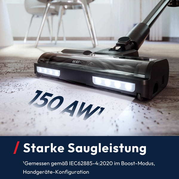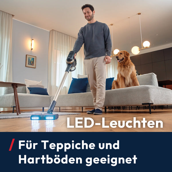 - DÜSE MIT LED-LICHT: Dieser leichte Akkustaubsauger wechselt mühelos von Teppich zu Hartboden. Integrierte LEDs und Anti-Twist-Bürste verhindern Haarverwicklungen.